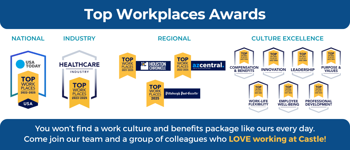 Every employee at Castle has an impact on patient care, and we work to ensure that everyone finds their work to be both challenging and rewarding. We behave with integrity and treat our colleagues with respect and kindness. Our culture fosters an environment of trust, transparency, and collaboration. We prioritize and encourage internal growth and professional development.